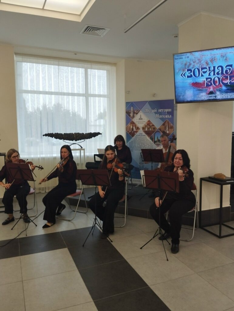 Открытие выставки «Зорная восень» 08.09.2025 mdshi4 5 сентября 2025 года Народный камерный ансамбль «Элегия» (руководитель Лазаренко Т. Н.) Могилевской детской школы искусств №4 принял участие в открытии выставки «Зорная восень», которая открылась в Выставочном зале.